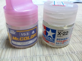 右、タミヤのX22クリヤー。左、ミスターカラーのレッドパール。